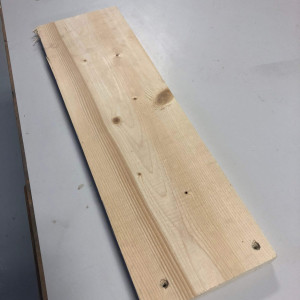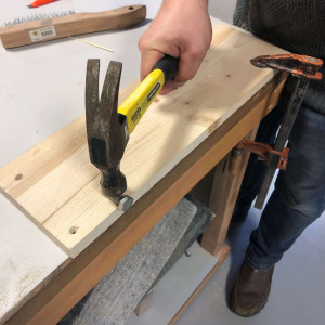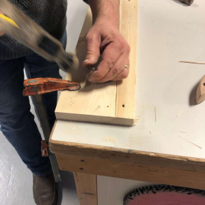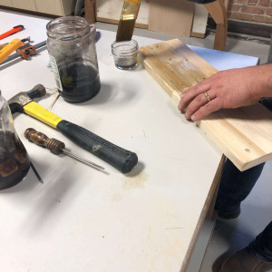 Once we wire brushed the wood, we dinged it up in a number of different ways. Hit it with a hammer, pounded the threads of a bolt into the grain, drove a few nails and pulled them out, and finally poked a few holes to look like worm holes.