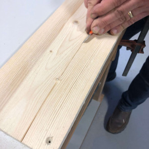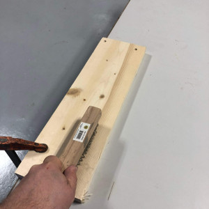- Use a clamp to secure the board to your work bench. Then you can put both hands on the brush and get a little more leverage. And, even if the clamp leaves a dent in the wood, it’s no big deal! You’re distressing it anyway.