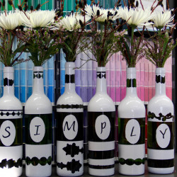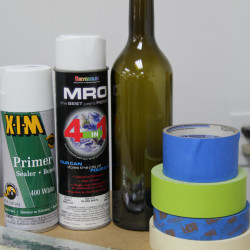 Now, the concept behind this project is simple. Betsy taped off or masked off sections of the bottles and then painted them. Once the paint was dry, she removed the tape or masking to reveal areas that received no paint, thus creating the designs.