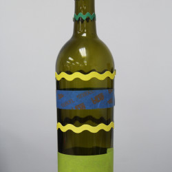 To create your designs, you can use tape, stickers, or whatever else you can come up with! In her project, Betsy used a combination of masking tape and scrapbooking border stickers. Simply apply the stickers and tape over the bottles in whatever patterns you would like to create. Get creative here and don’t be afraid to experiment with a few different looks!